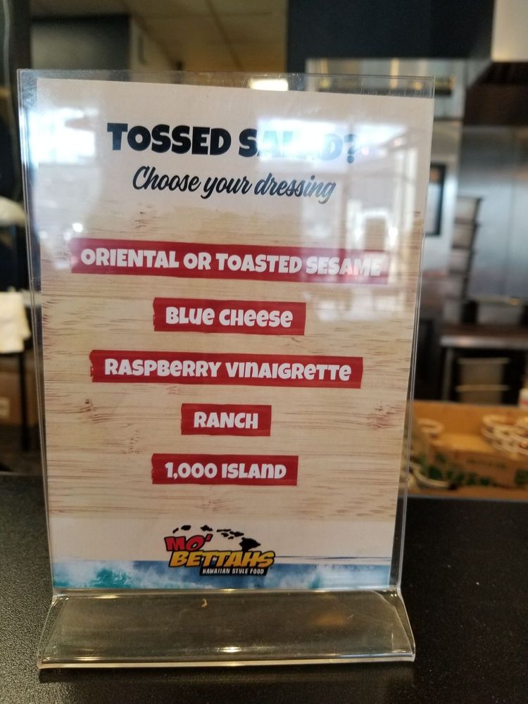Romaine salad served with 1 meat choice, grape tomatoes, mandarin oranges, green onions, wonton chips, and 1 (1.5 oz) dressing packet. We recommend the original Pake Salad with Teriyaki Chicken and Oriental dressing.