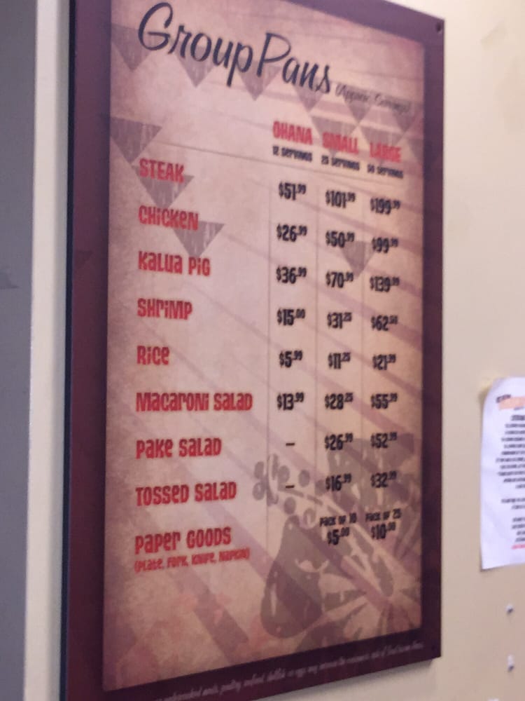A complete meal for your family of 6, including 12 pieces of your choice of chicken or 36 oz of Kalua Pig; 8 scoops of white or brown rice, 8 scoops of macaroni salad or tossed salad & dressing for 6; 8 sauce cups; plates and cutlery.
